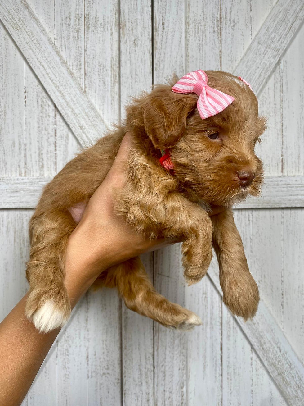 Tilly had 5 (4 males, 1 female) mini goldendoodles born on April 28. They are estimated to be 15-20 pounds full-grown. We will temperament test and do puppy picking June 7-14 and they'll transition to their forever homes when they are 8-9 weeks old (June 21-28). Some pups will have brown noses and light eyes like mama. Check out our social media pages here to see current photos/videos.